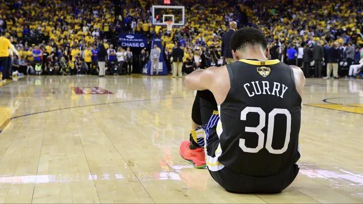 这一幕让我们想起了6年前的总决赛,汤神遭遇左膝十字韧带撕裂,库里坐在地上的背影。