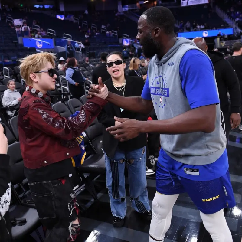 赛前,德雷蒙德-格林与中国说唱歌手王以太握手致意,并在其获赠的专属球衣上留下签名。