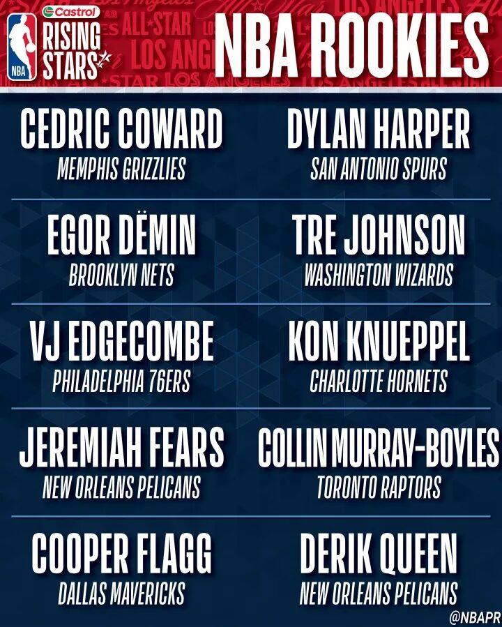一年级10人:弗拉格(独行侠)、克尼佩尔(黄蜂)、埃奇库姆(76人)、科沃德(灰熊)、奎因(鹈鹕)、特雷·约翰逊(奇才)、迪伦·哈珀(马刺)、博伊尔斯(猛龙)、杰明(篮网)、费尔斯(鹈鹕);