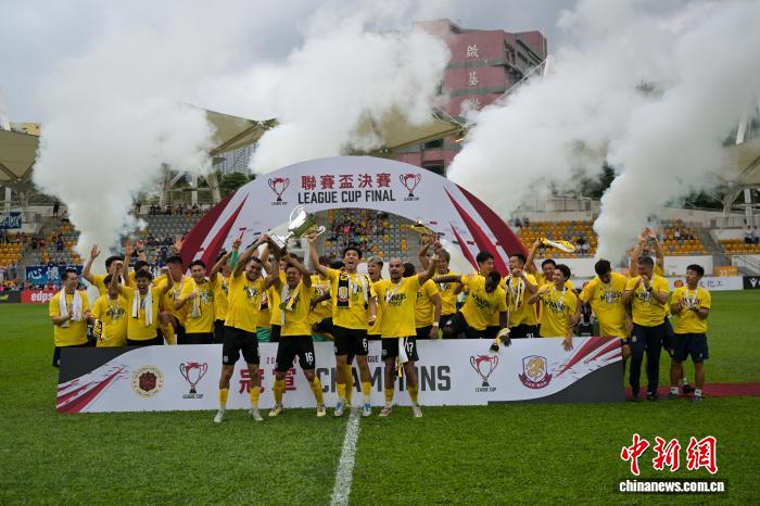 4月7日,2025-26年度中国香港足球总会联赛杯决赛在香港旺角大球场上演,理文队以2:1击败杰志队,夺得冠军。理文队成立于2017年,是香港足坛劲旅。图为理文队球员胡晋铭(黄衣)与杰志队球员利安度拼抢。中新网记者 陈永诺 摄